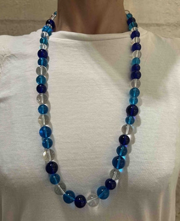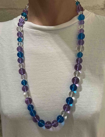 Glass beads, copper, stainless steel. Unique creation, limited edition of 150 copies. H: 11 cm L : 5 cm / Sold without cord. Public price : 840 € TTC (TVA à 20 %) Shipping costs not included.
